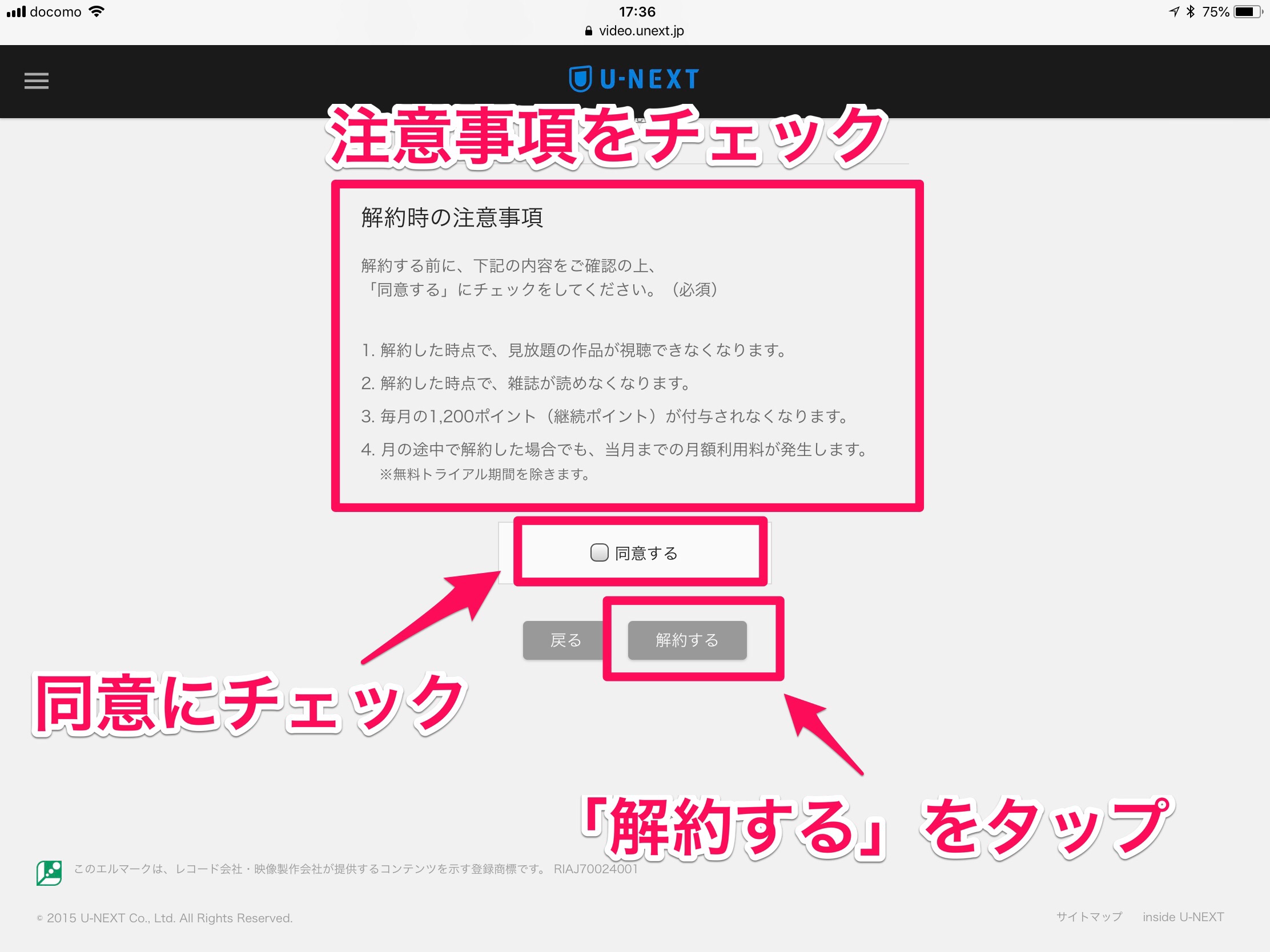 同意にチェックしまして、「解約する」をタップ。
