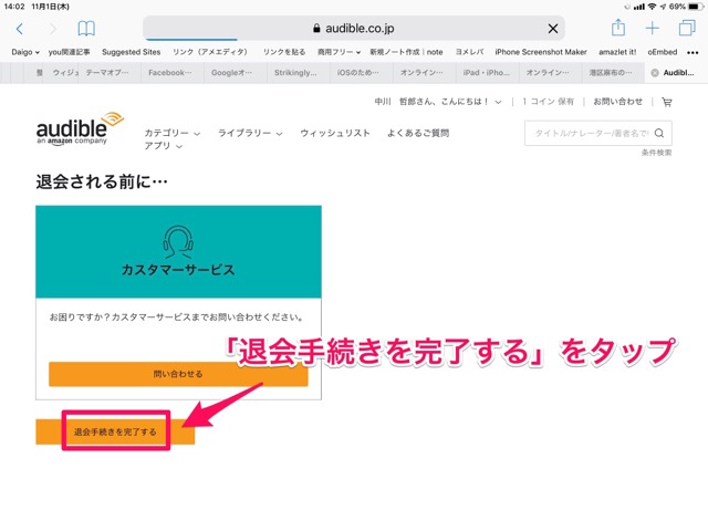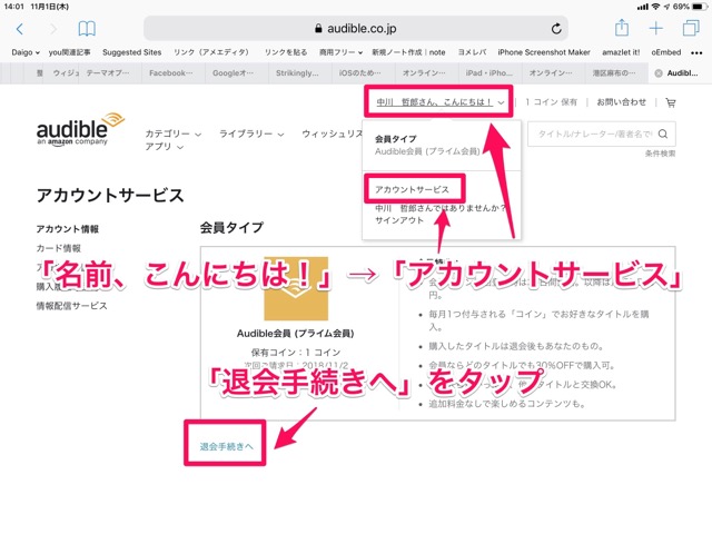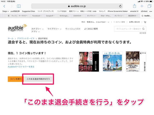 ここに小さく「退会手続きへ」があります。これを、タップ。