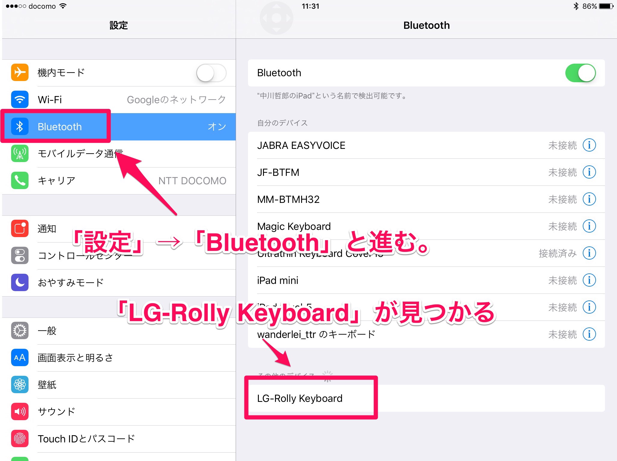 キーボードをペアリングモードにしないと、iPadから見つからないんですよね。