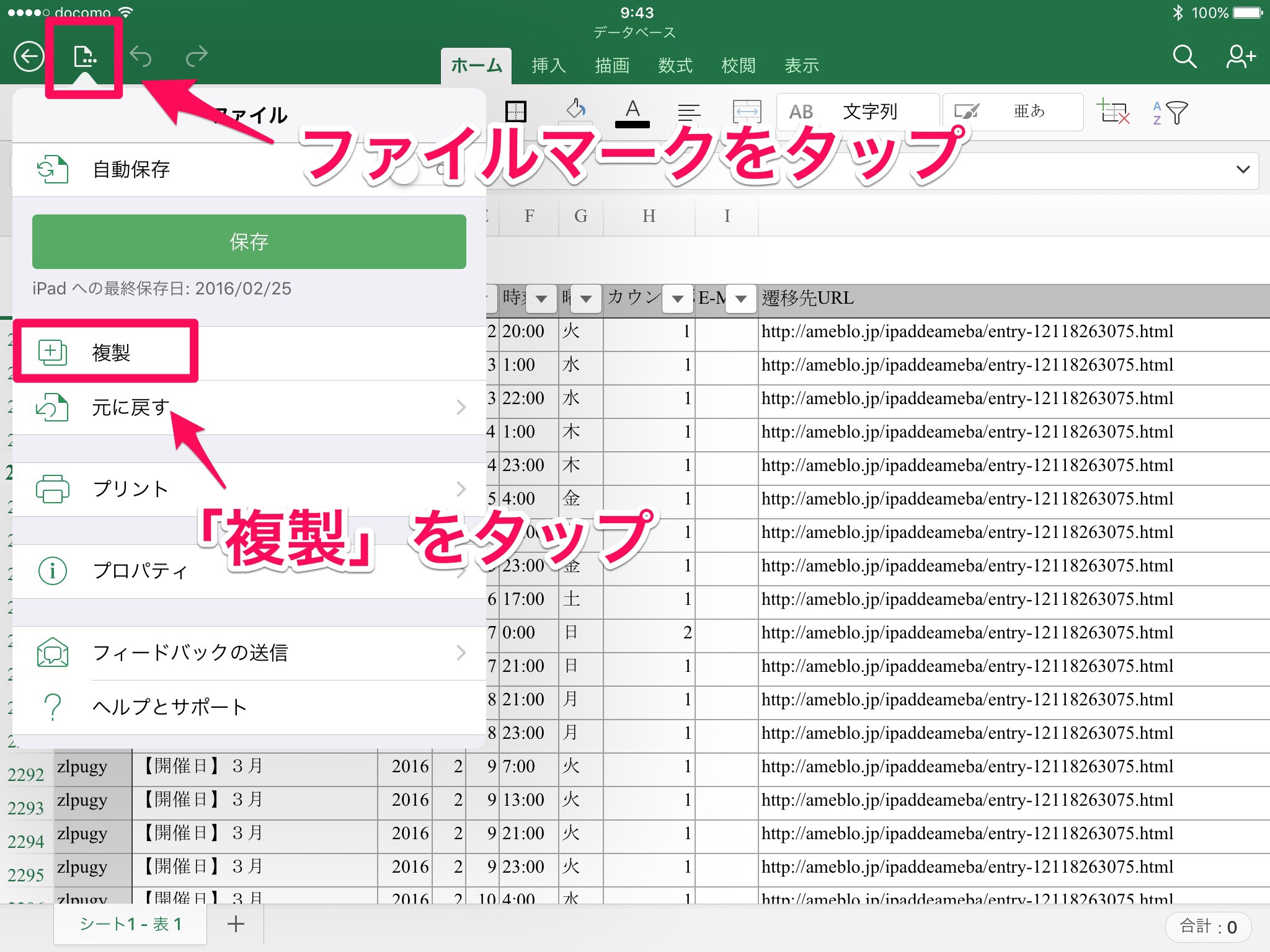 そして、左上のファイルマークをタップして、メニューを出したら、ここから「複製」をタップして選択。
