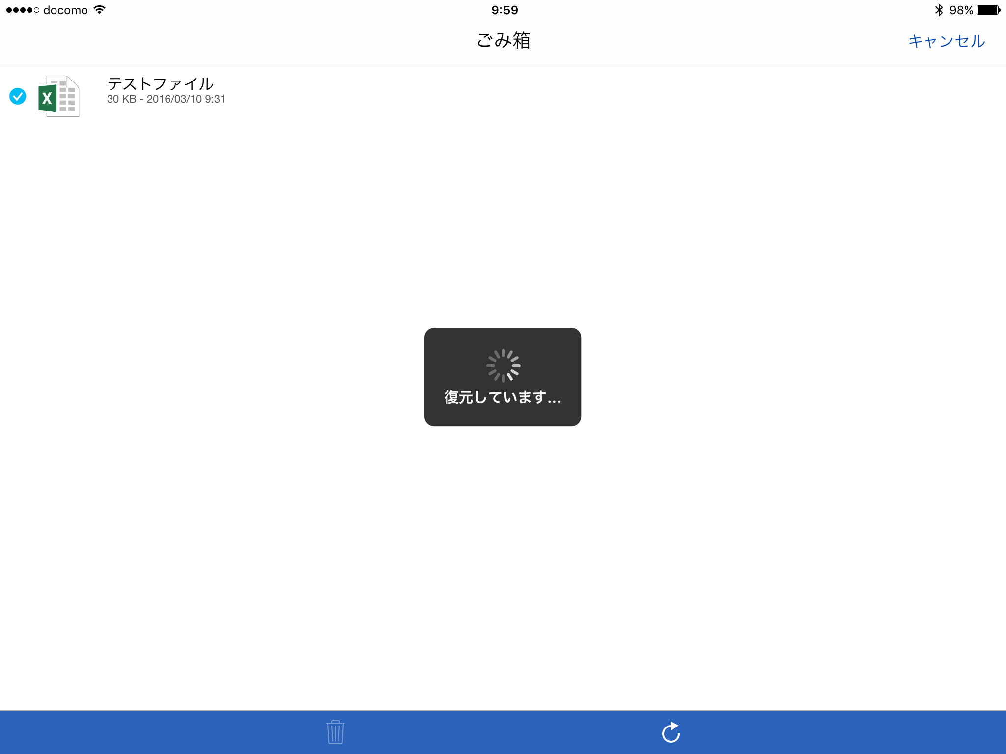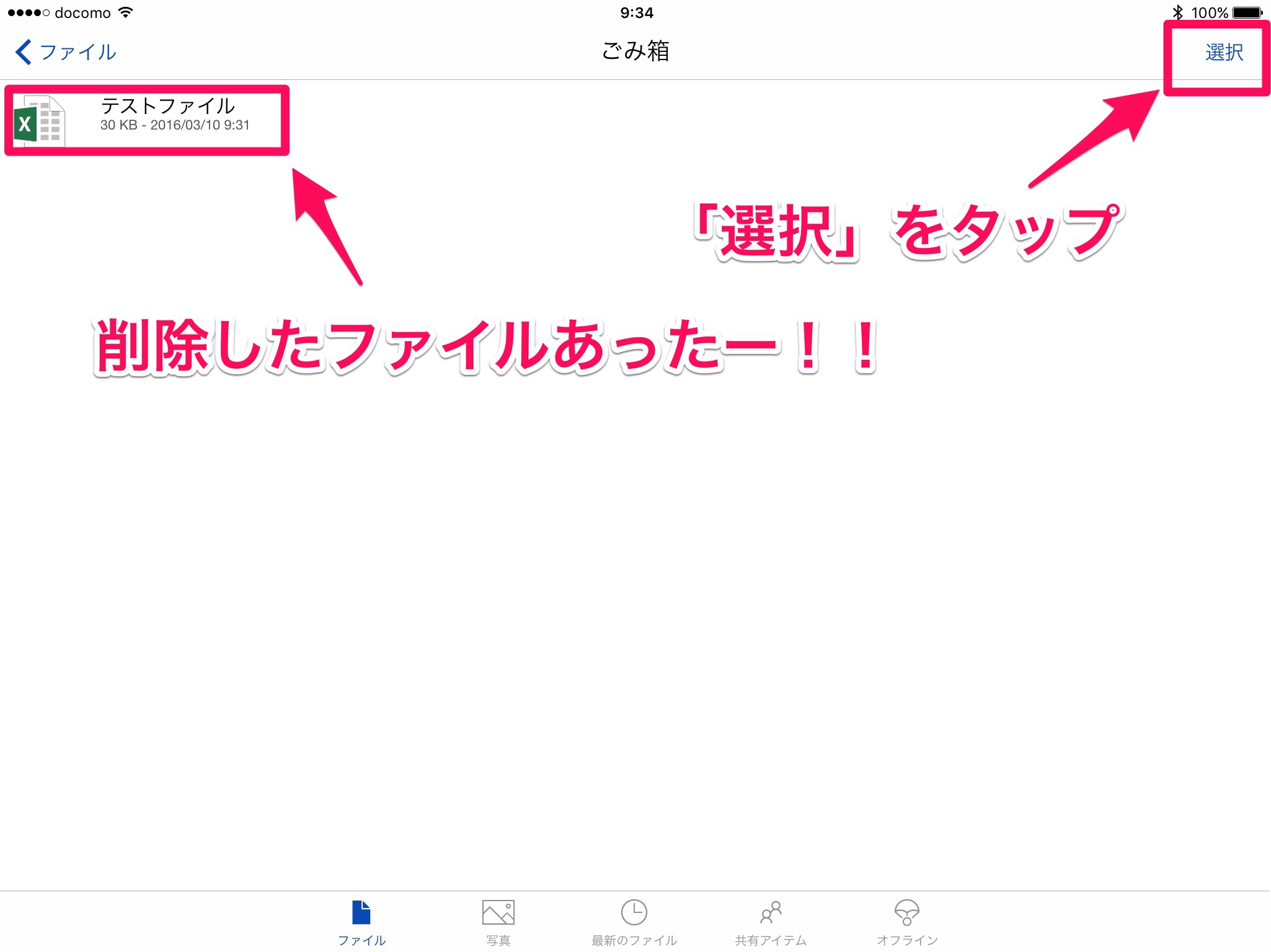 それでは、まずこのOneDriveに保存してある「テストファイル」っというのを削除します。