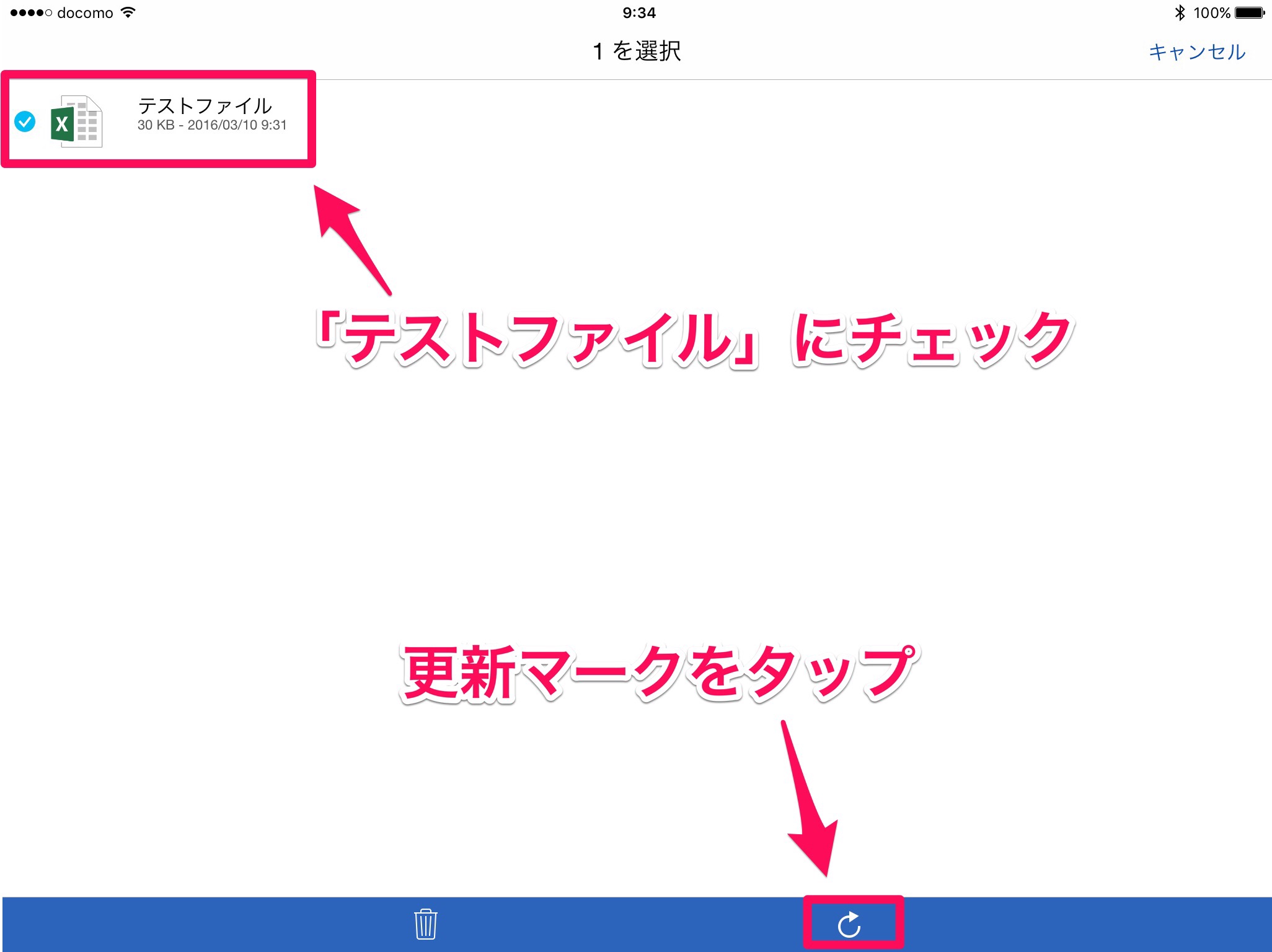 右上の「編集」をタップして「テストファイル」にチェックをつけます。