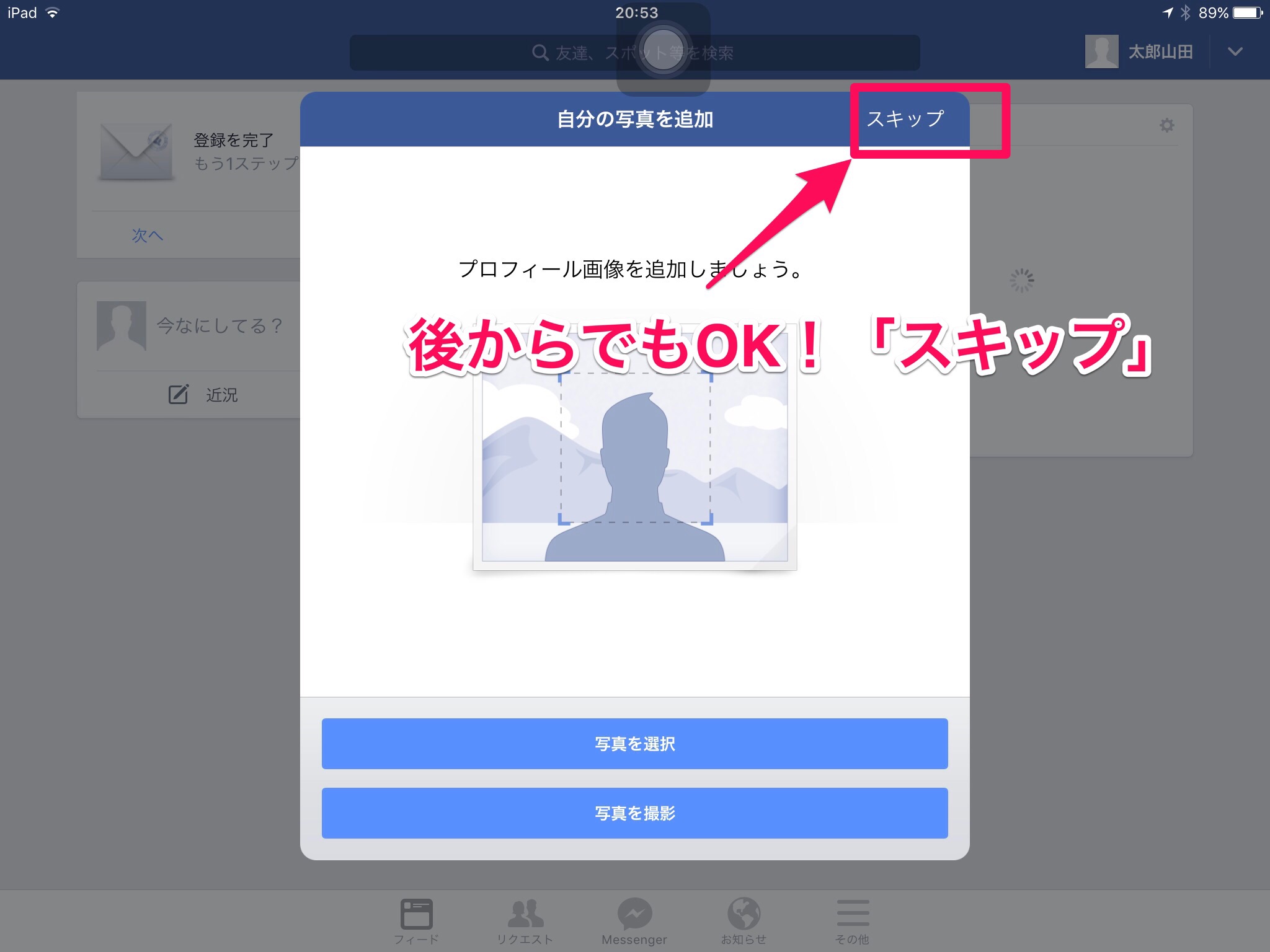 プロフィール写真。これも、後からでOKです。「スキップ」