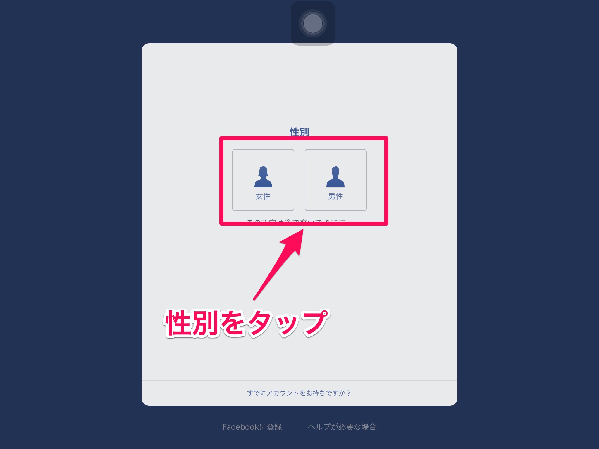 アプリを立ち上げるとこの画面。ここで、画面下にある「Facebookに登録」をタップ。わかりにくい!