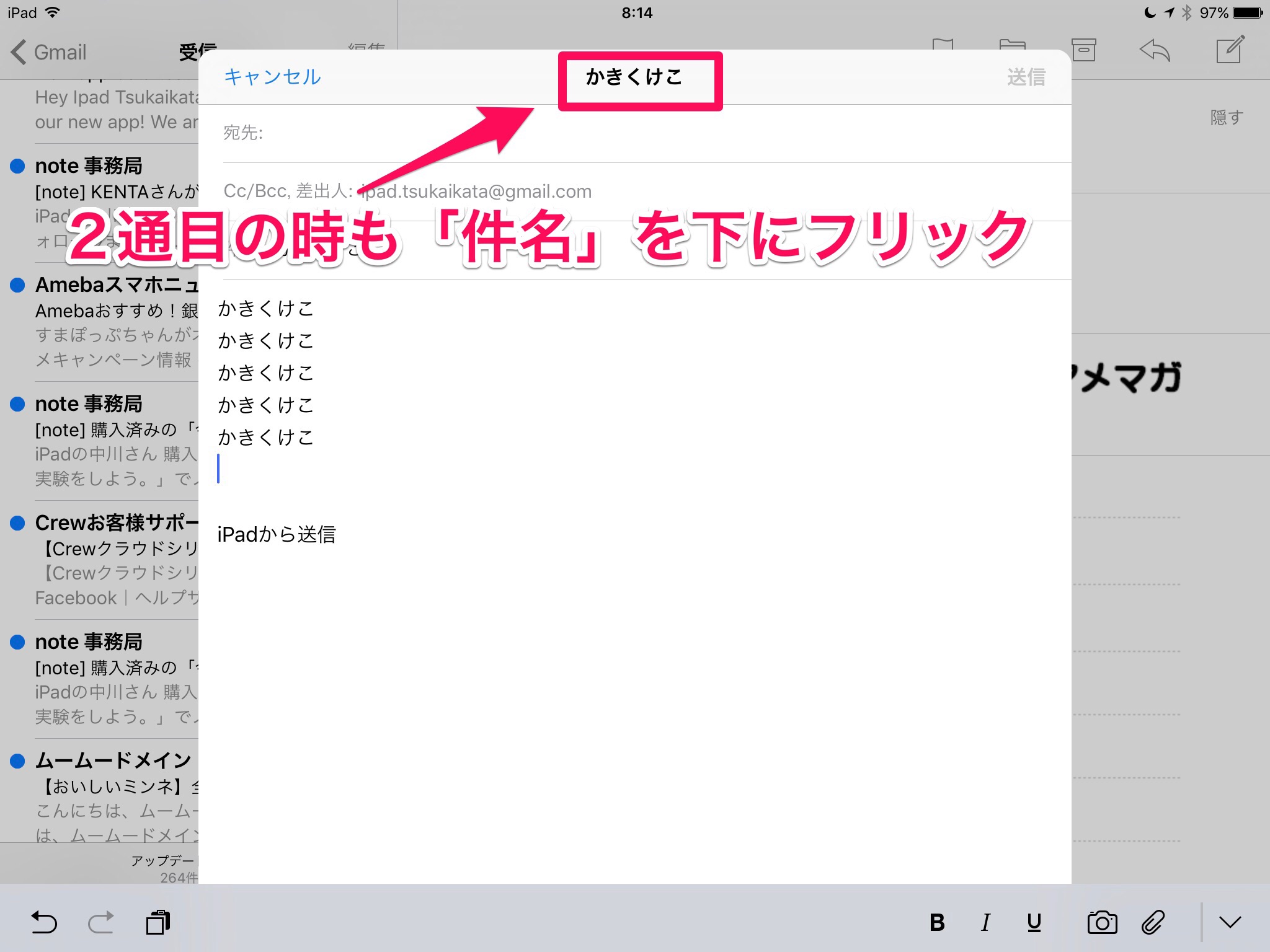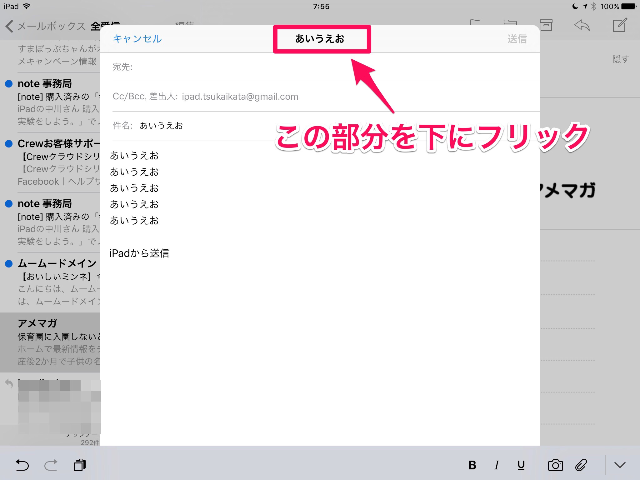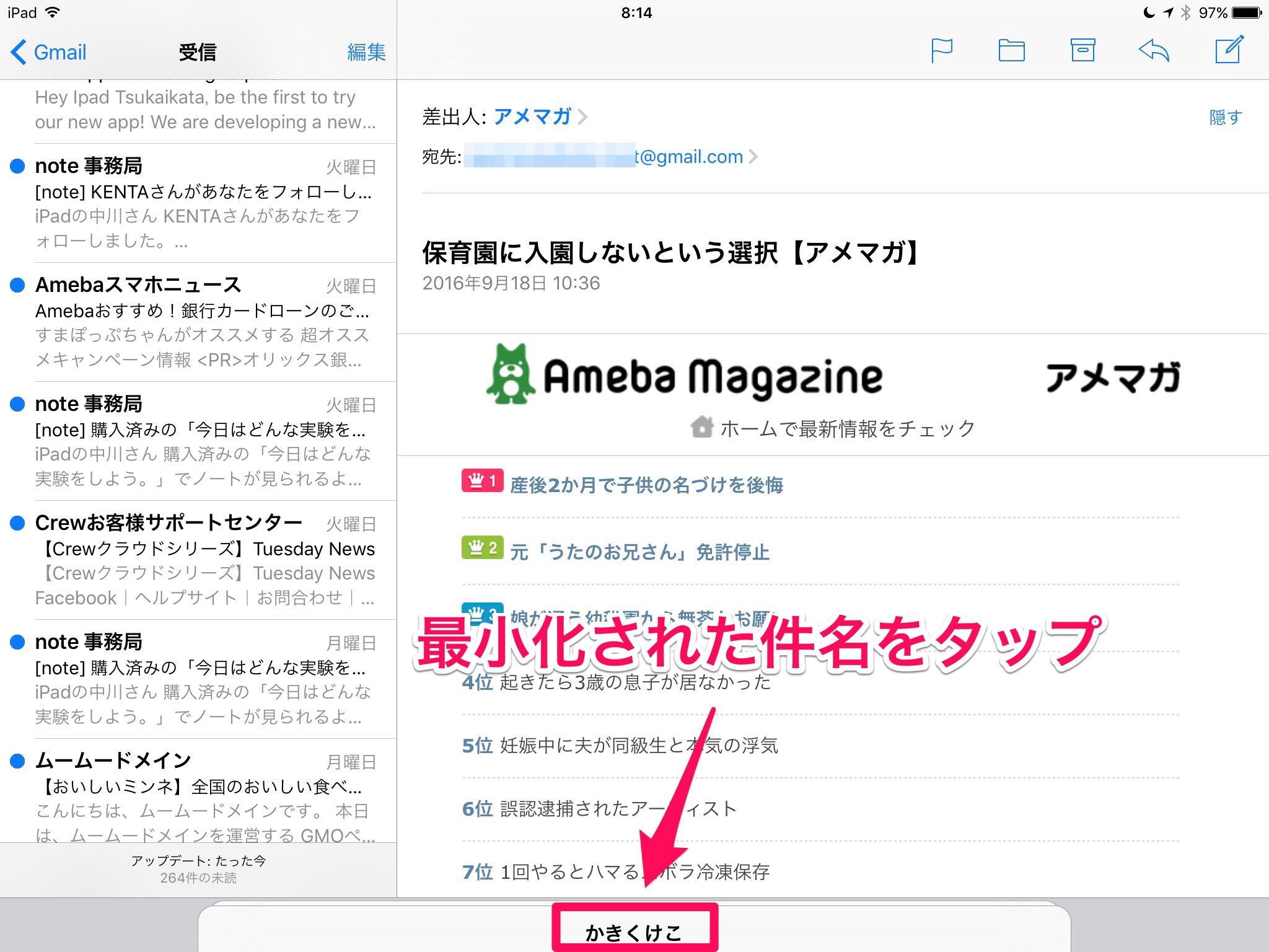 ここで、最小化します。メールのトップに表示されている「件名」の箇所を下にフリックします。