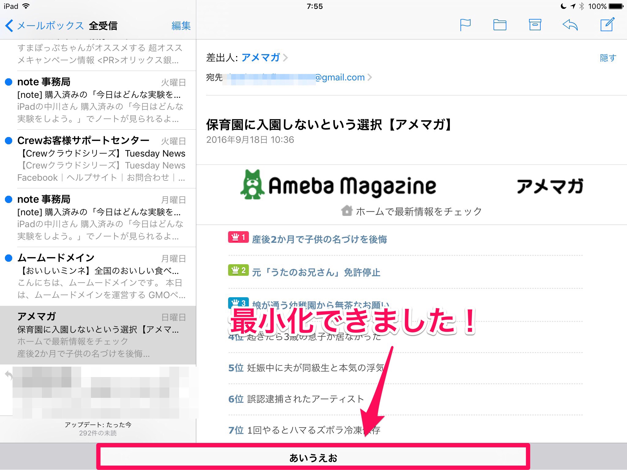 1つ目のメールに切り替えるには、いちど今書いてるメールを最小化します。下にフリック。