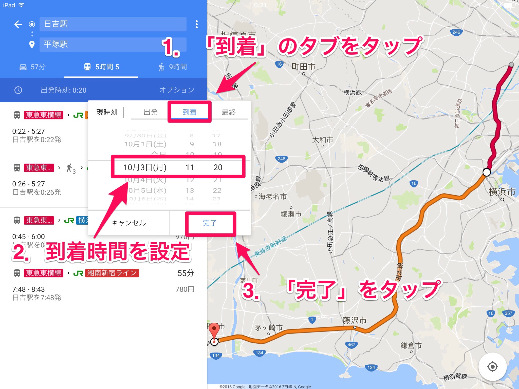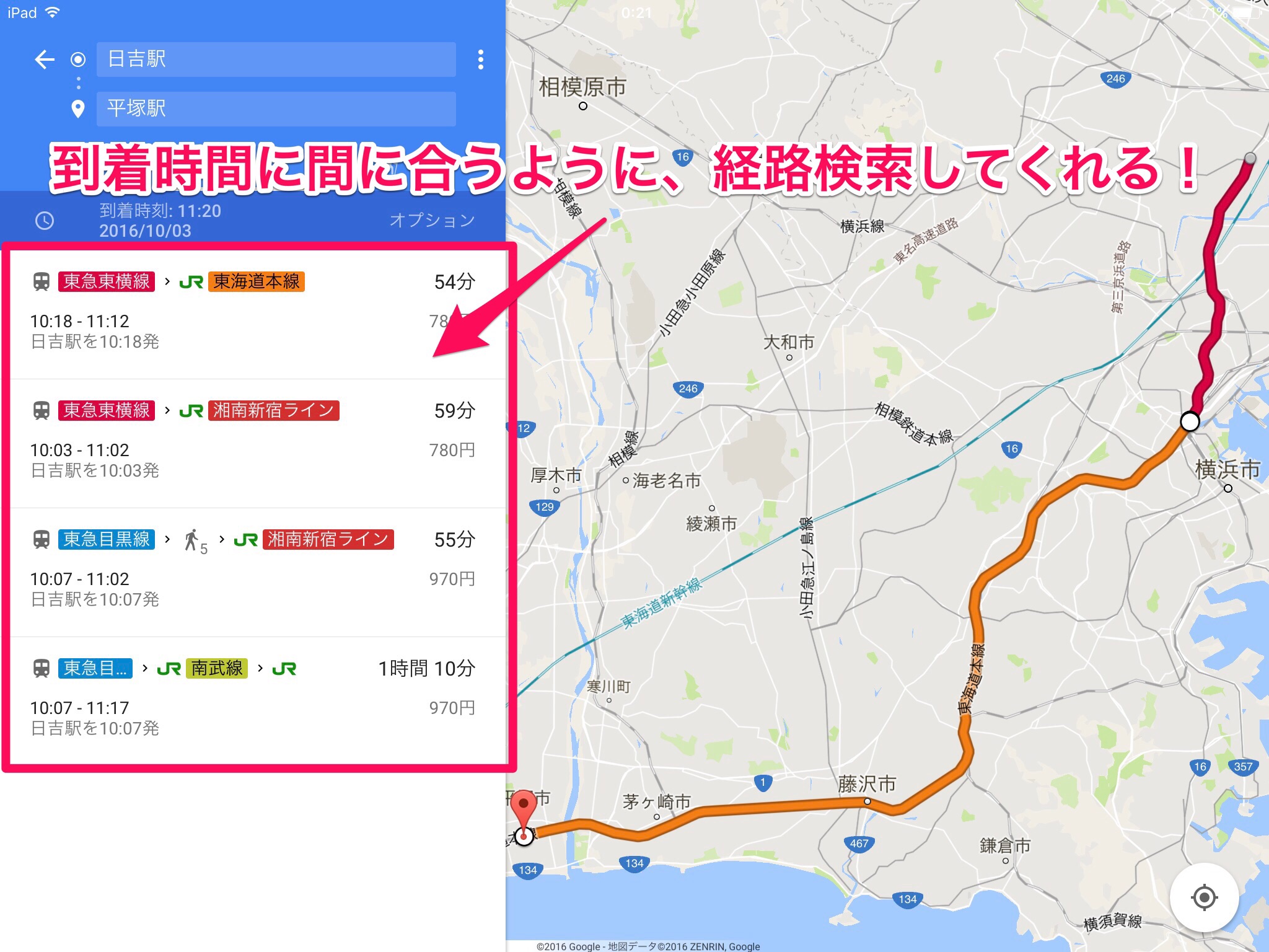 さらに、GoogleMapは「目的地の到着時間を設定」して検索する事ができるのです。