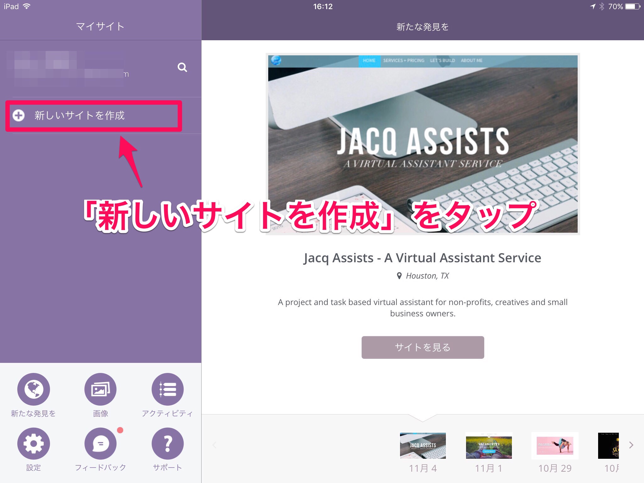 「新しいサイトを作成」というのがあります。ここをタップ