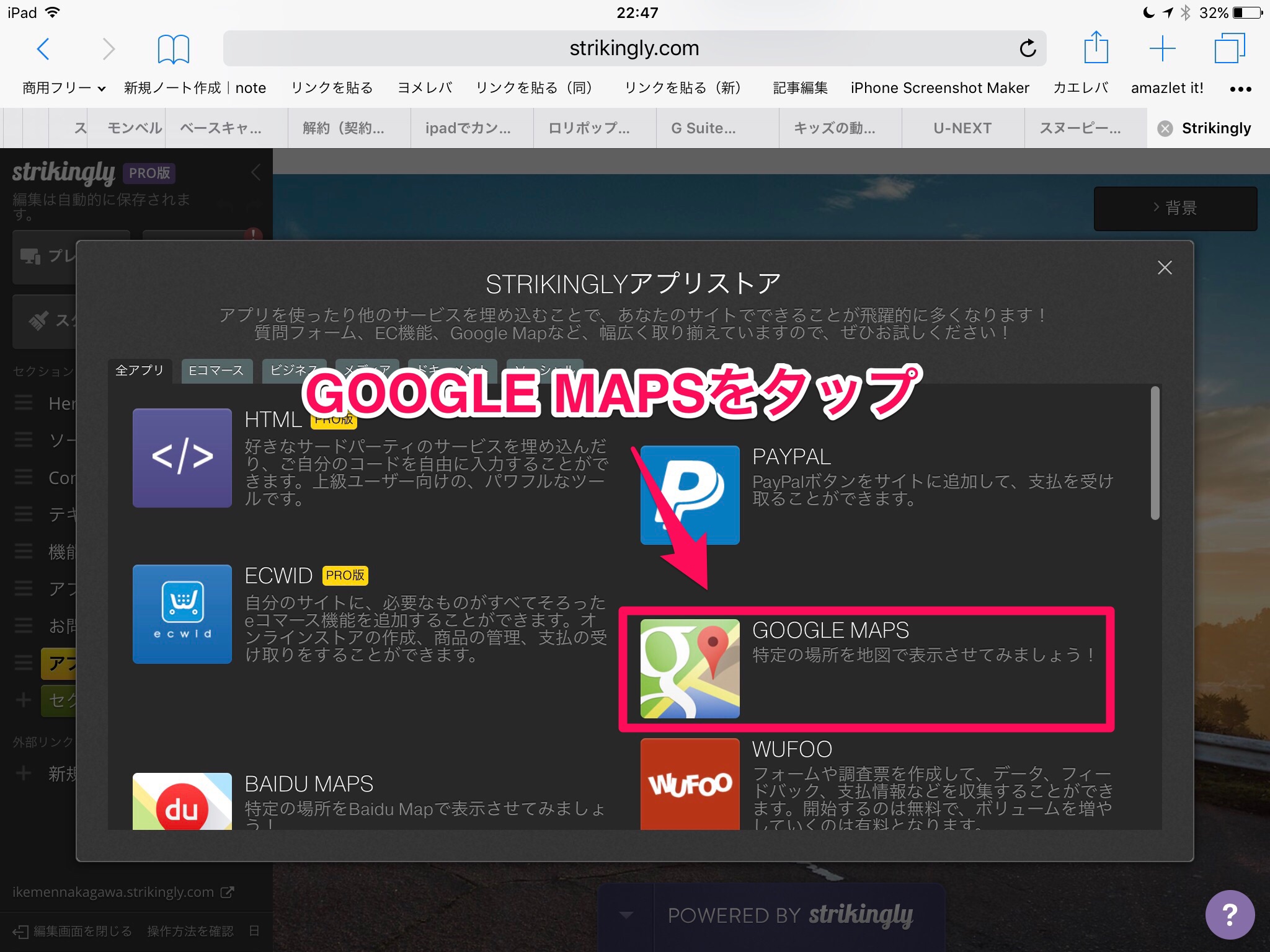 「Strikinglyアプリストア」にGoogleマップがあります。これをタップ。