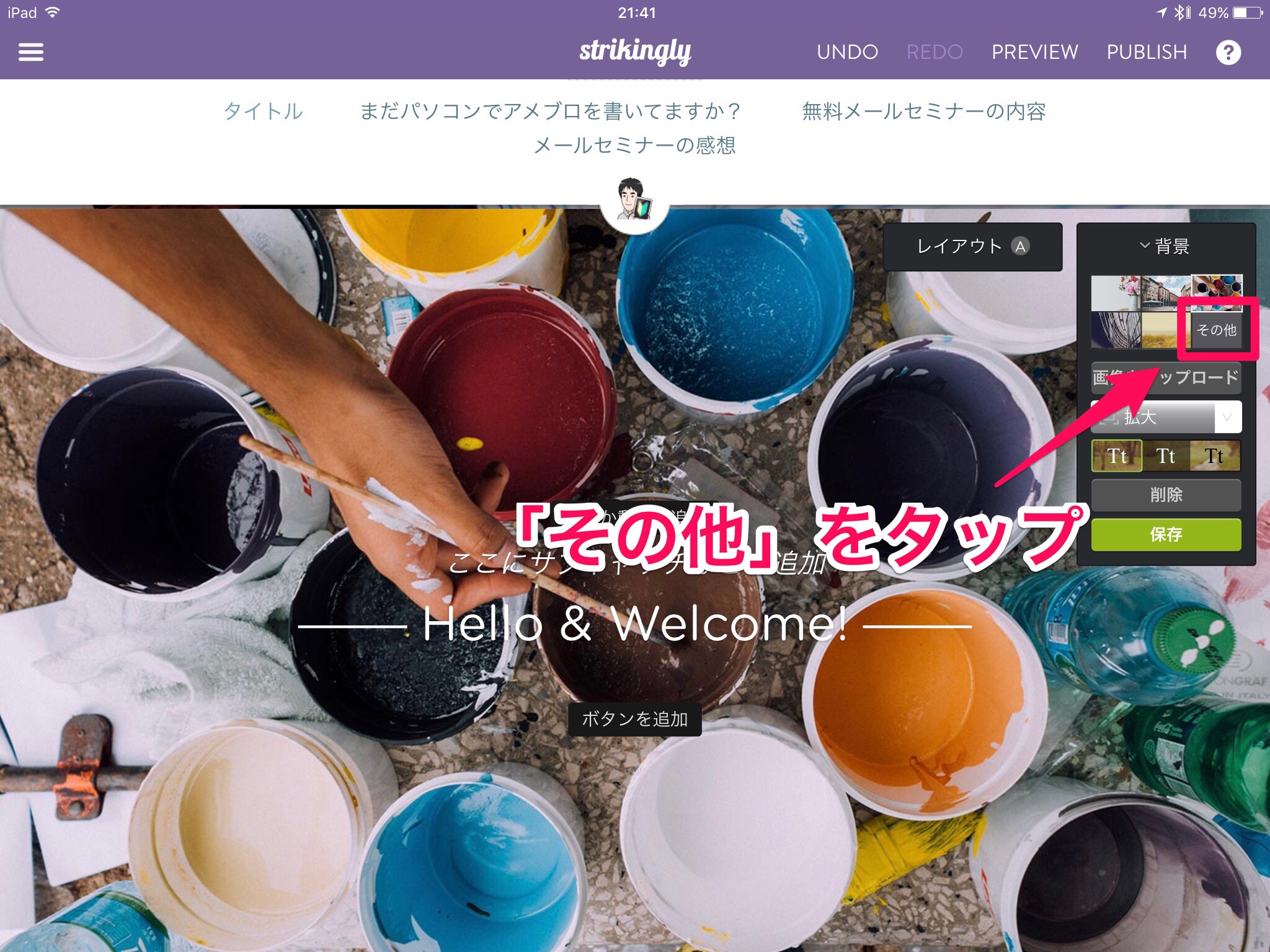 「新しい画像をアップロード」のタブをタップすると、iPadに入っている画像を背景画像に変更できます。