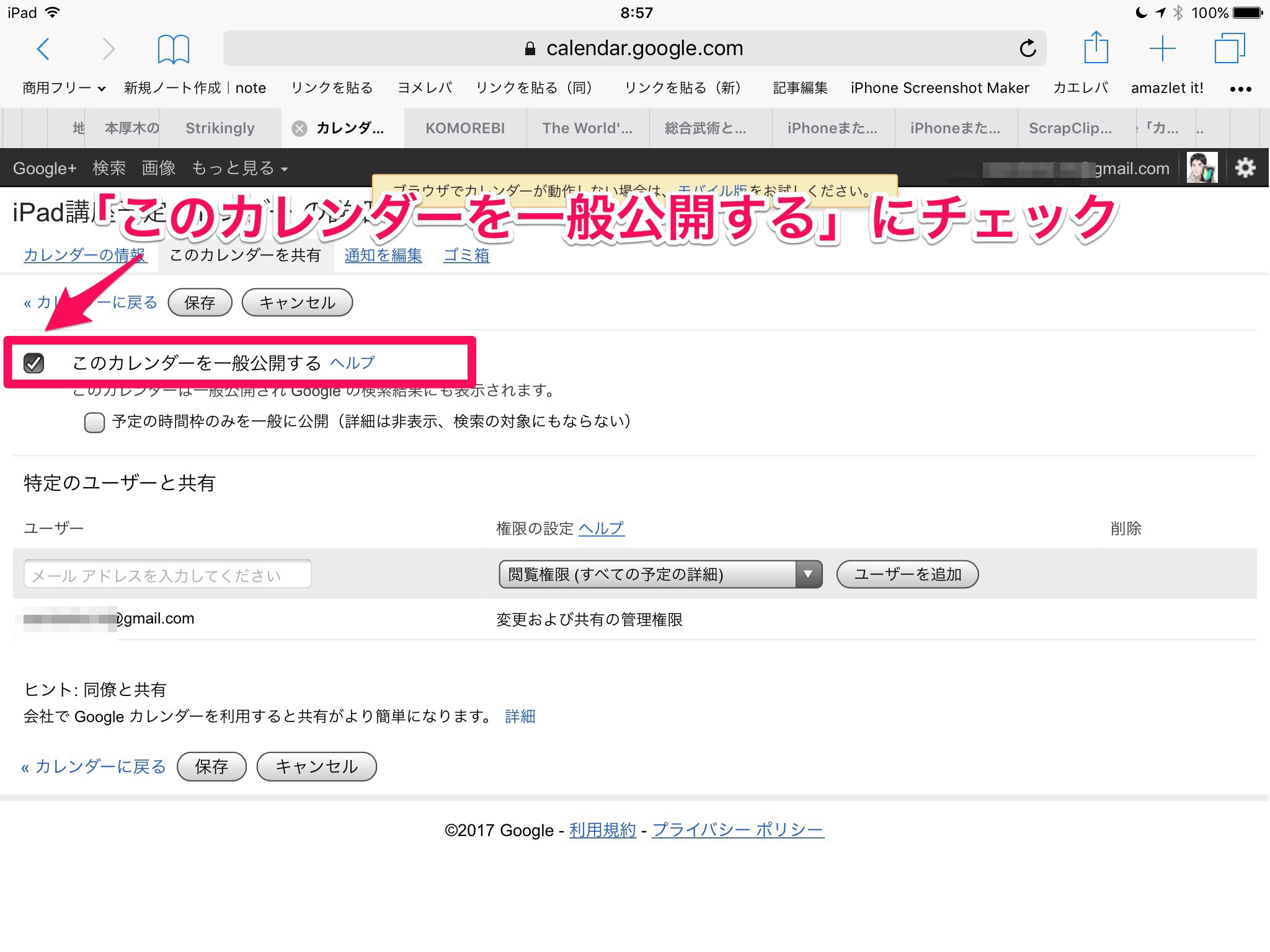 次の画面で「このカレンダーを一般公開する」にチェックを入れて「保存」をタップすれば、共有設定完了です( ̄^ ̄)ゞ
