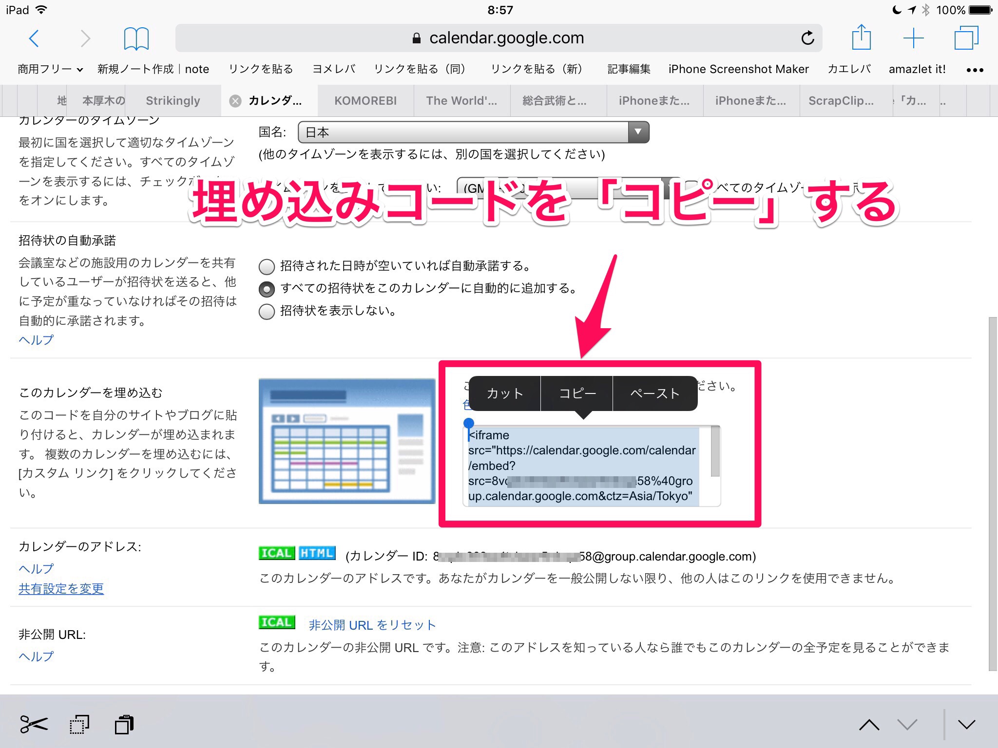 スクロールした真ん中ほどに、「このカレンダーを埋め込む」という項目あり、ここに埋め込みコードがあります。