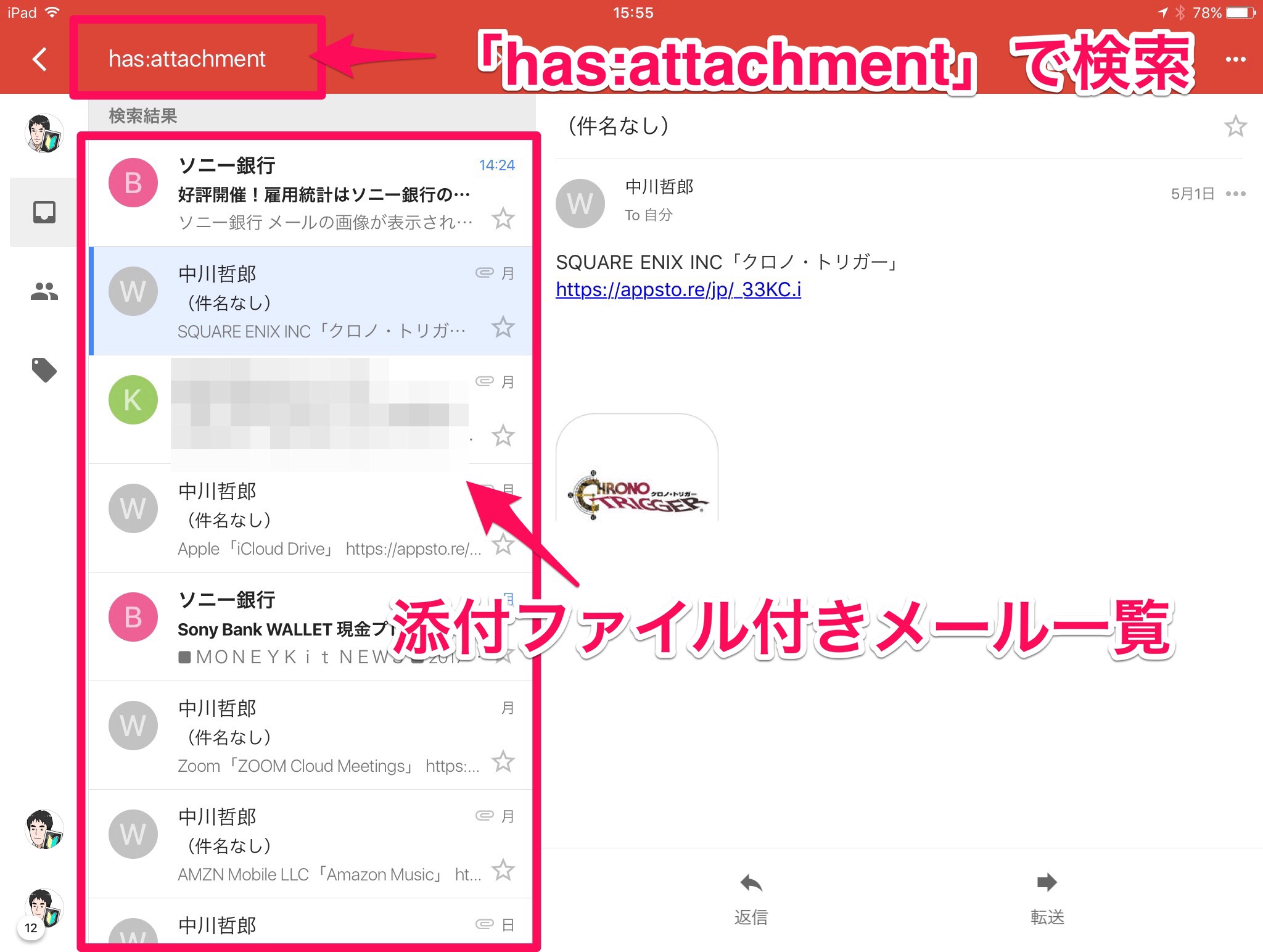 Gmailアプリで、「添付ファイル付きメール」を表示する方法