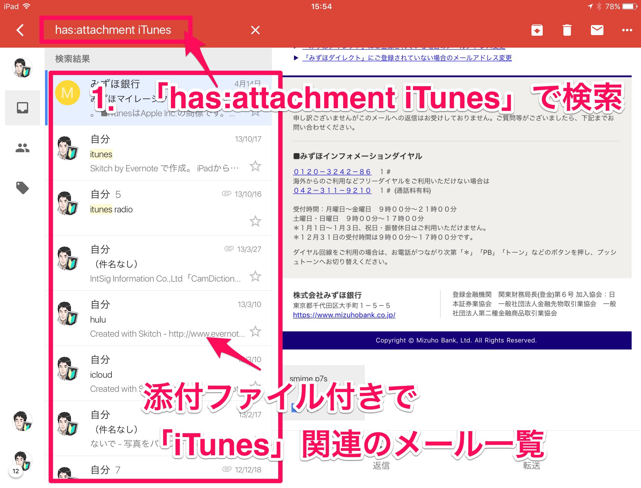 それでは、添付ファイル付きメールの中で「iTunes関連」のメールを検索する場合は、、、、