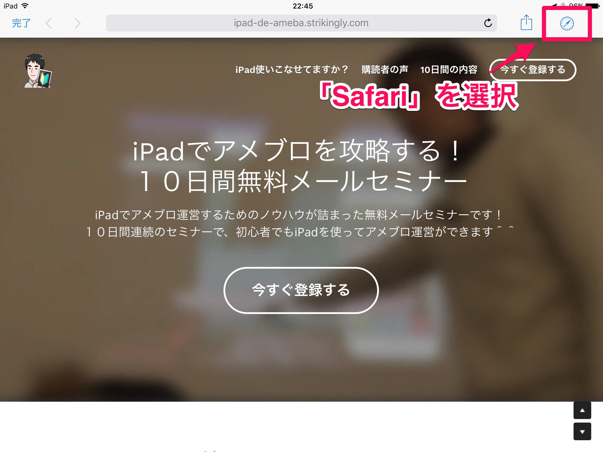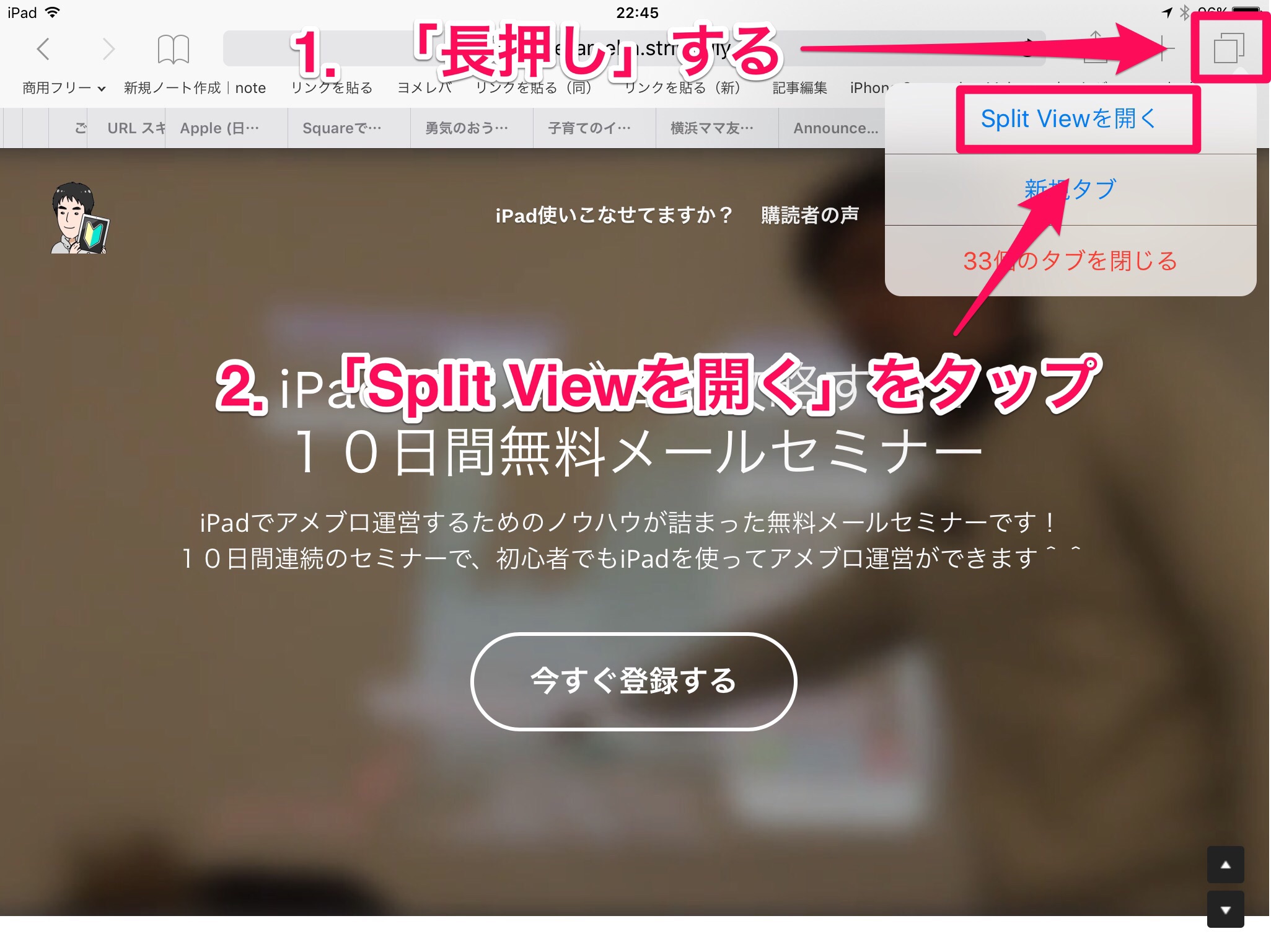 Safariで公開したホームページを開いたら、右側の四角マークを長押し「SplitViewで開く」をタップ。
