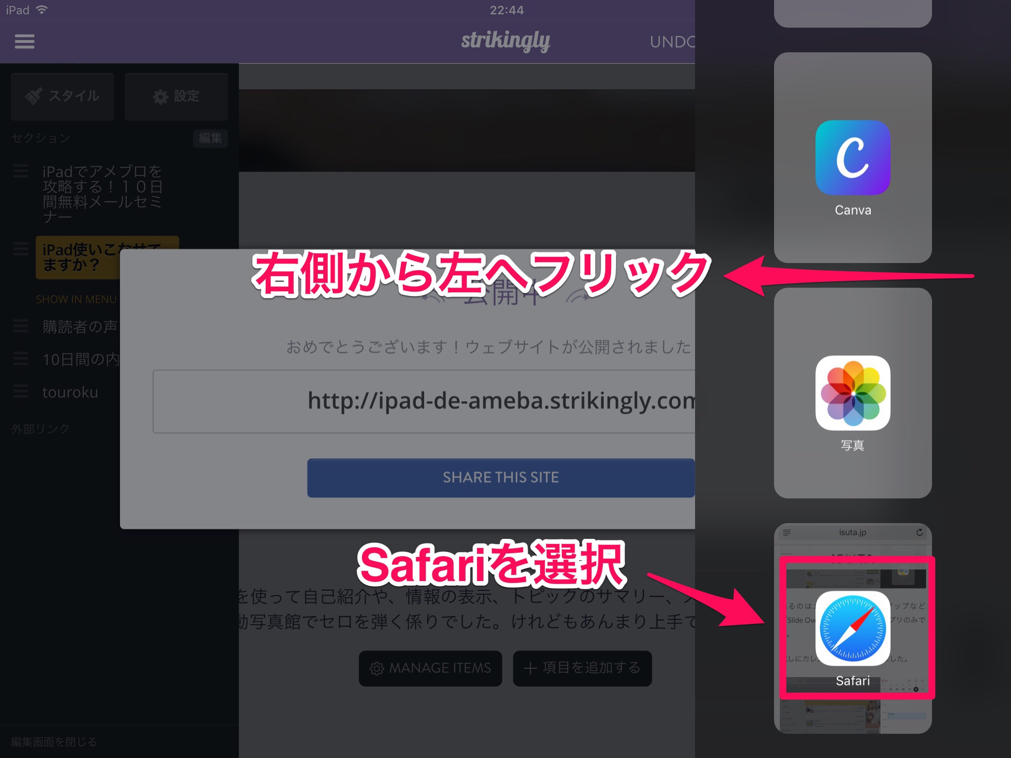 ホームページ公開した後、右側から別のアプリを起動できます。