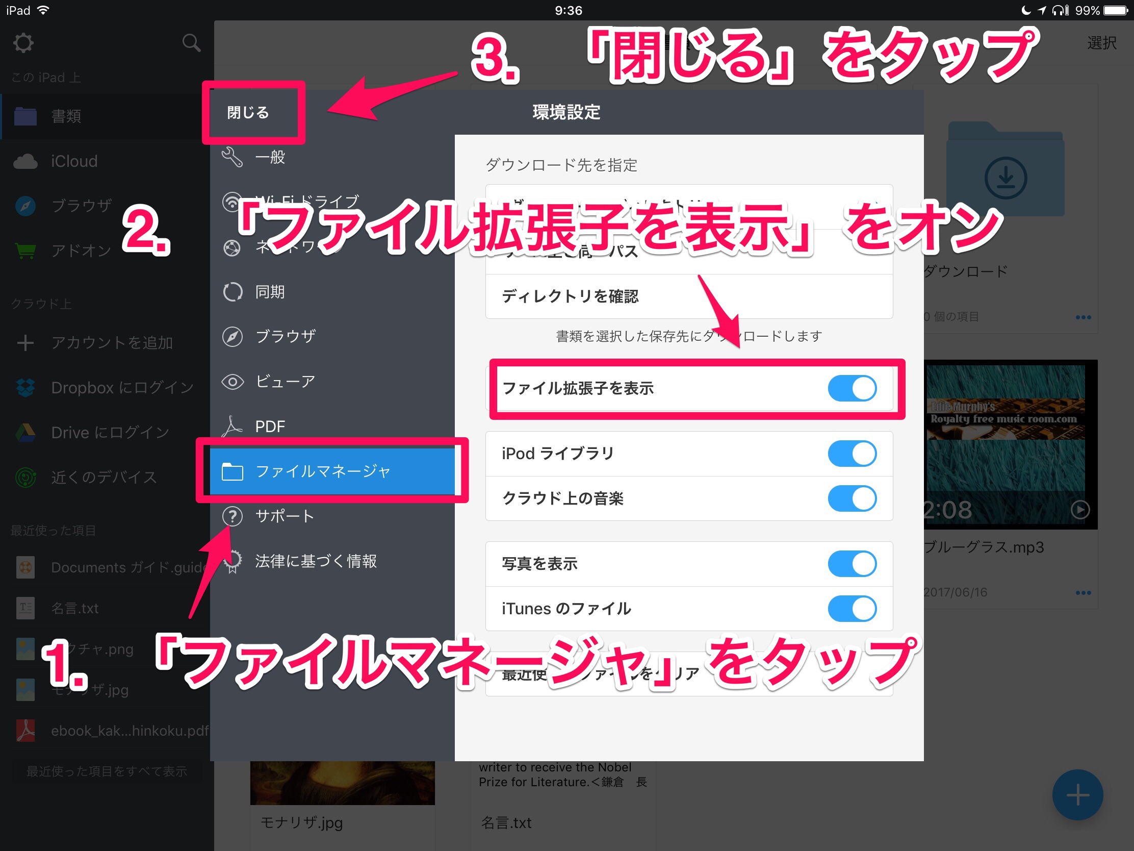 「歯車」→「ファイルマネージャ」→「ファイル拡張子を表示」