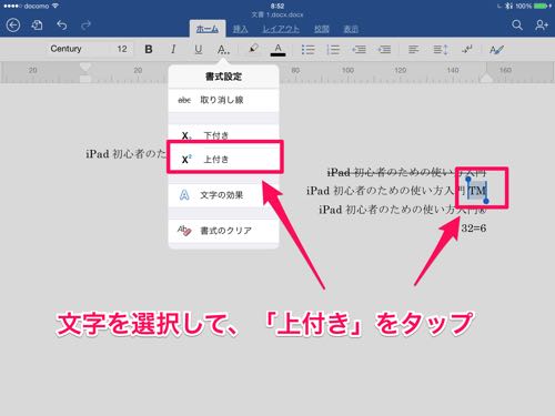 iPad版Wordの使い方 文字の上付き、下付きをする(指数や™や、®などに)