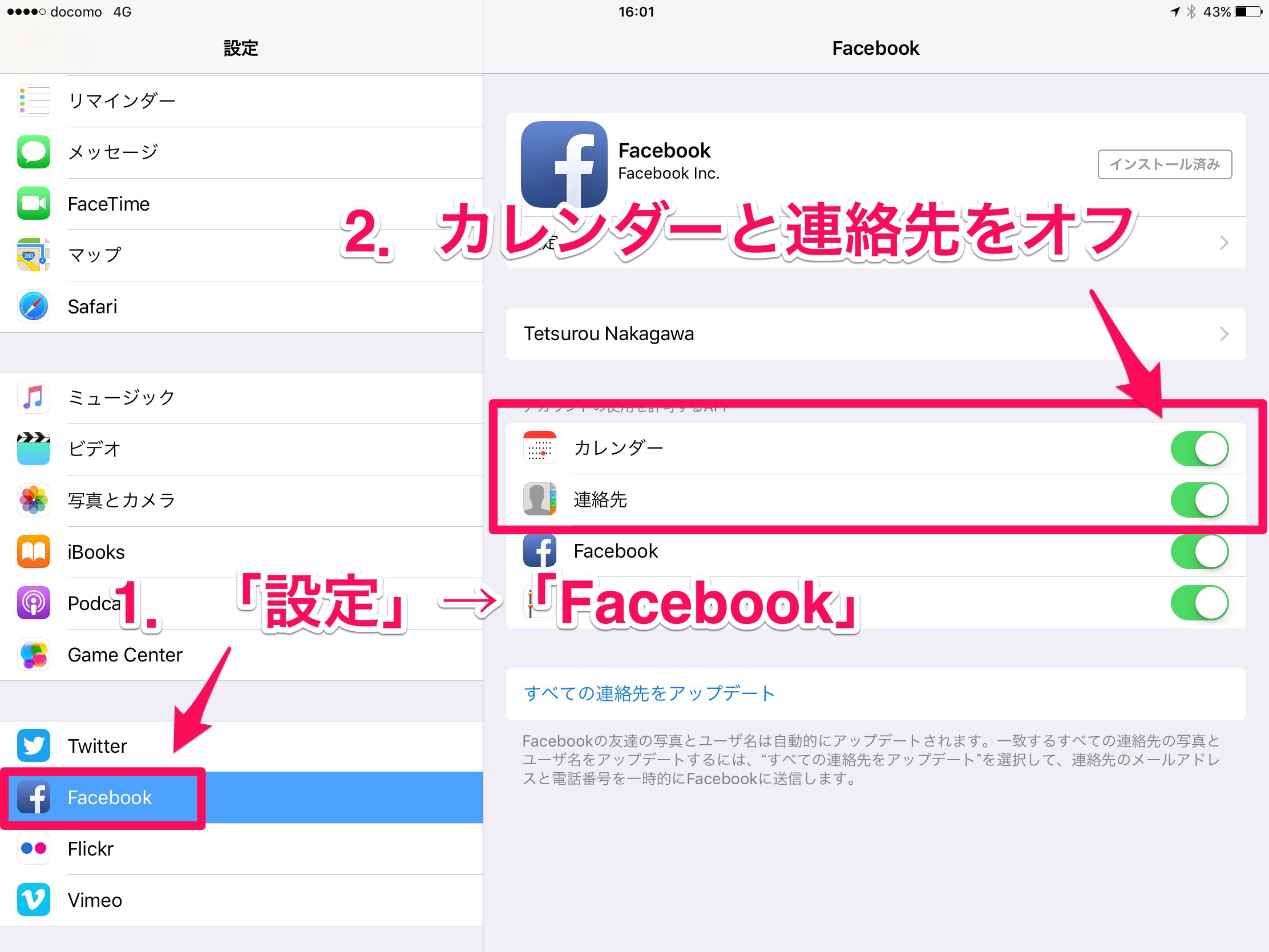 設定からFacebookの項目をオフにする