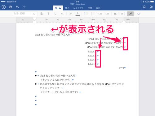 段落を合わせる時や、文章全体の見栄えを調整する時に、どこで改行されているを視覚で確認できるようにするとわかりやすいです