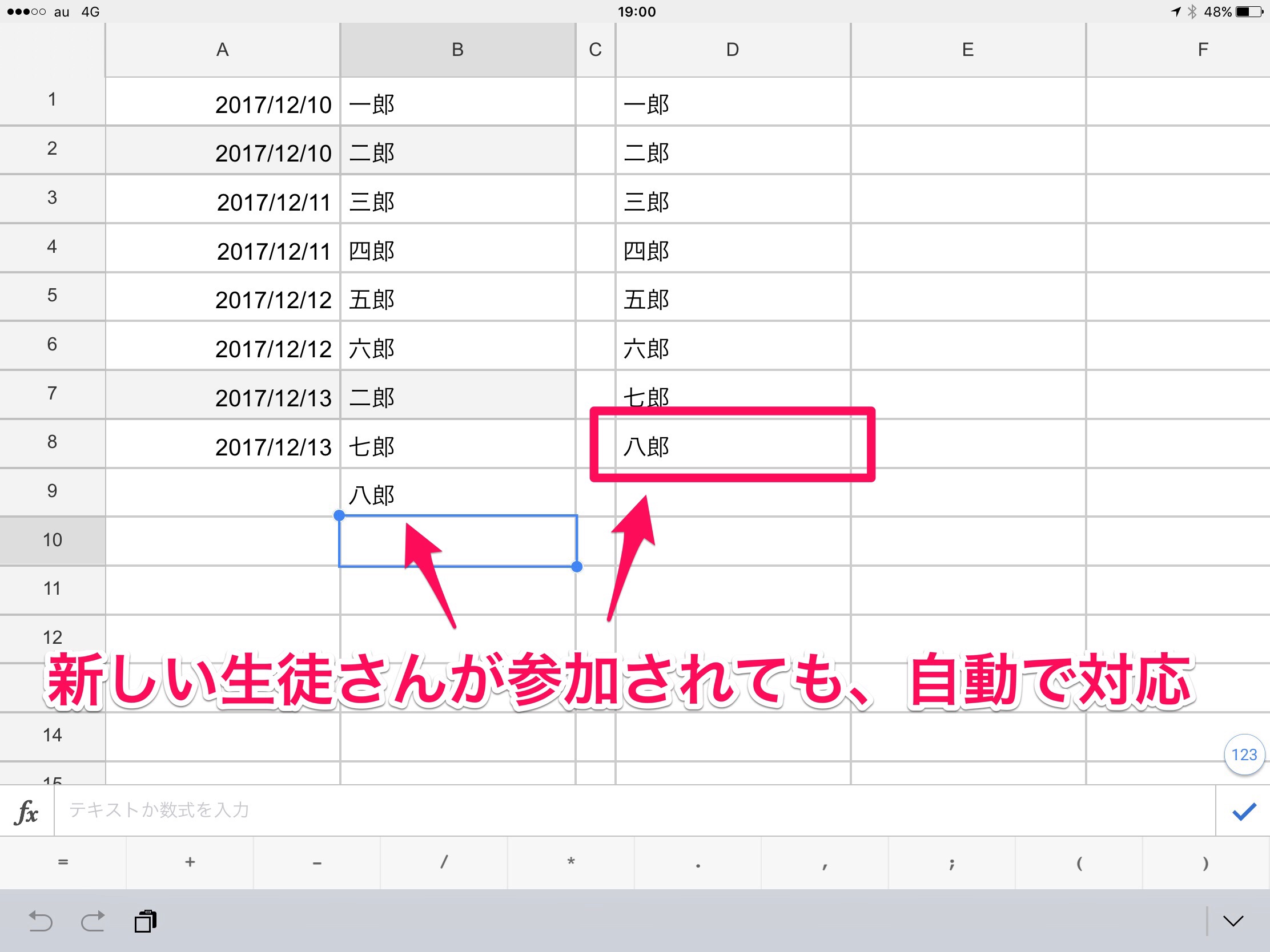 B列に八郎君を加えると、自動でD列に八郎君が表示されます!!!