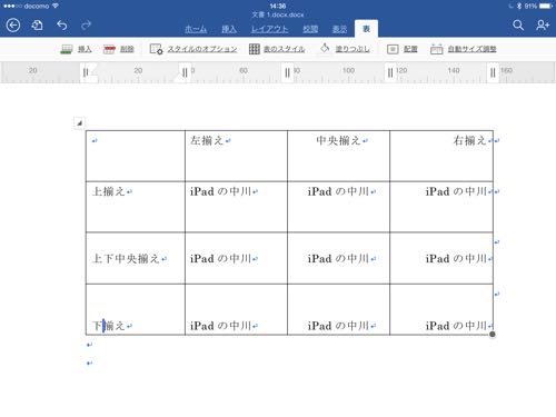 iPad版Wordの使い方 表の中の文章を右揃え、中央、左揃えにする